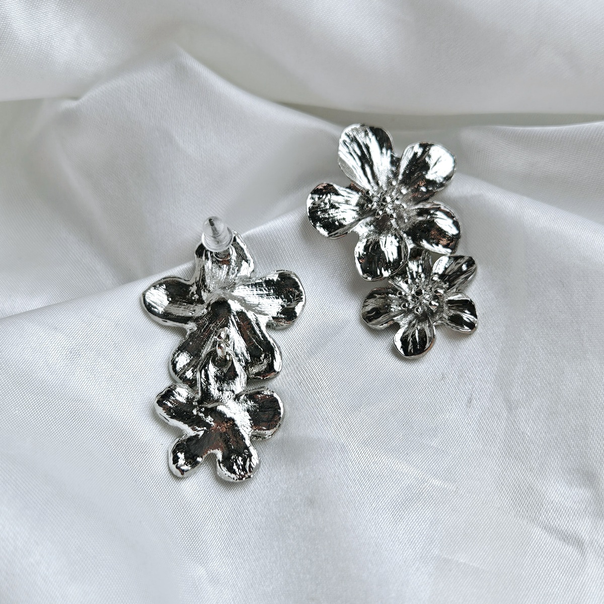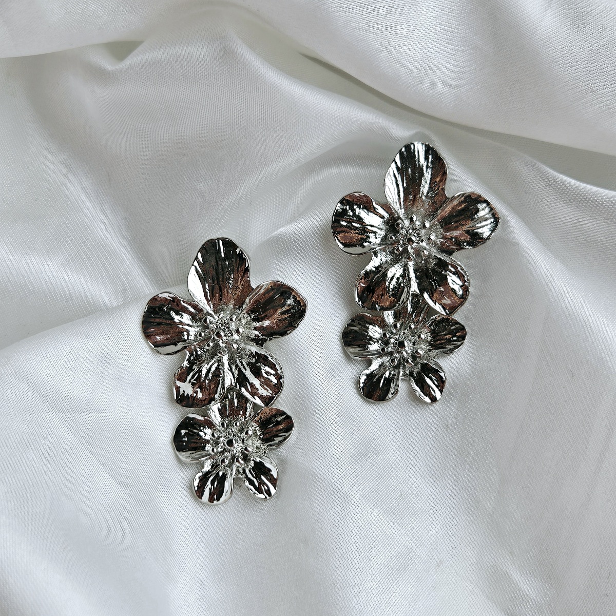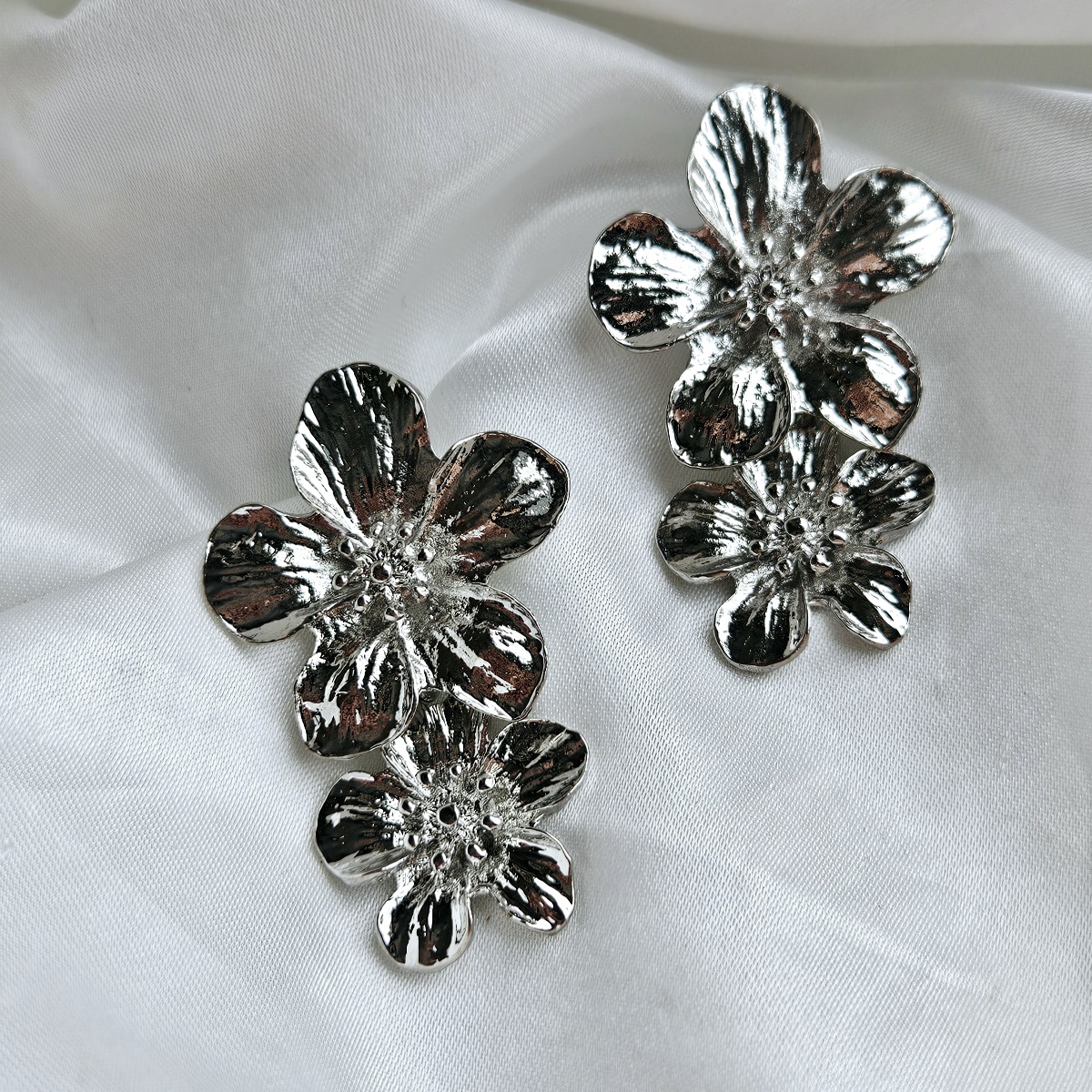 Dvigubų sidabro spalvos gėlių auskarai